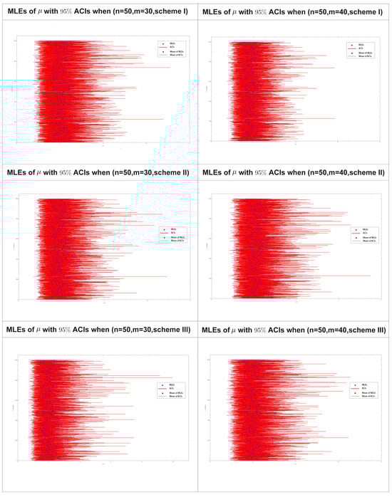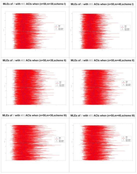 Figure 10 displays the 95% confidence intervals (CIs) obtained using the maximum likelihood estimation distribution of for 1000 progressively type-II censored samples obtained using various drawing schemes, as listed in Table 10 for samples sizes and .