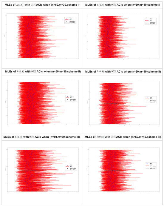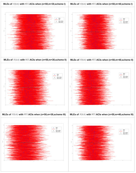 Figure 8 displays the 95% confidence intervals (CIs) obtained using the maximum likelihood estimation distribution of for 1000 progressively type-II censored samples obtained using various drawing schemes, as listed in Table 8 for samples sizes (50, 30) and (50, 40).