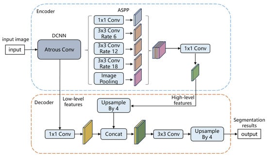 An overview of DeepLabv3+ architecture is shown in Figure 1. The coding part of the architecture is composed of a spatial pyramid pooling module from ASPP [32] and a deep convolutional network. The integration of multi-scale information is mostly the responsibility of ASPP, while the deep convolutional network leverages some popular classification networks such as ResNet and Xception. By supplementing DeepLabv3 with the decoder module, DeepLabv3+ improves edge delineation accuracy by enabling a more optimal combination of low-level and high-level characteristics.