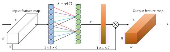 Efficient Channel Attention, as an optimized channel attention module [35], adopts a lightweight design, as shown in Figure 4. ECA implements information transfer between different channels using a one-dimensional convolution, where the size of the convolution kernel is adaptively varied by a specific function, which ensures the good performance of the network and reduces the operational complexity.