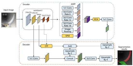 Defect detection for drainage pipes is usually carried out by pipe inspection robots entering the inside of the pipe to obtain video data. Due to environmental and mobile device limitations, the lightweight MobileNet V2 [36] is introduced to ensure that the model can accurately segment defects while minimizing the computational volume and complexity of the model. In addition, this paper is also based on the Deeplabv3+ network, which has made some improvements in the encoding stage and decoding stage. The overall structure of the model is shown in Figure 5.