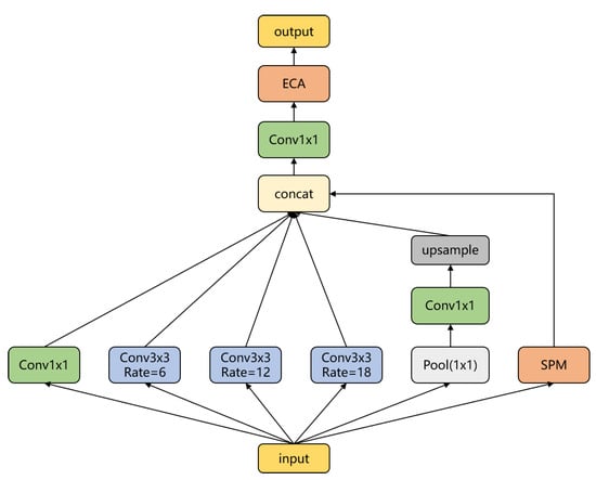 Deeplabv3+ mainly consists of a backbone network plus an ASPP module in the encoding stage, aiming at acquiring high-level semantic features of the image, in which the ASPP consists of a 1 × 1 convolution, three 3 × 3 nulling convolutions with different nulling rates, and a global average pooling at the image level. However, the module relies more on square convolution and pooling operations for feature extraction from the images and cannot extract features for the anisotropic feature extraction capabilities. In addition, there are anisotropic defects in drain-related defects, such as concealed branch connection and tree roots. Therefore, in this paper, by adding a branch to the ASPP structure, the strip pooling module (SPM) is introduced to enhance the feature extraction capabilities of anomalies. For global average pooling, the strip pooling is designed to focus more on the narrow and long region rather than the complete element map, which can prevent the generation of most irrelevant connections. And adding an ECA mechanism after ASPP is more conducive to the information interaction between each output result after each parallel operation and can also further obtain useful information, as shown in Figure 6.