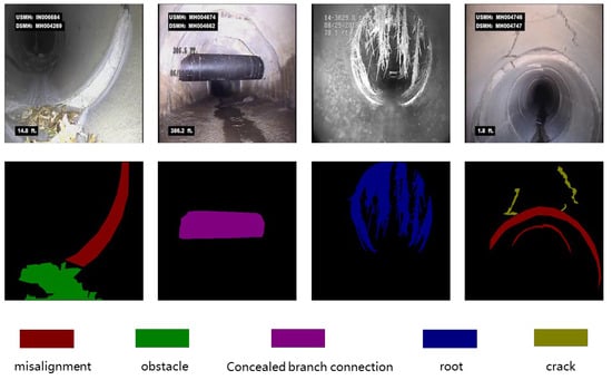 This experiment created a new, homemade dataset that was first used for defect detection by using 989 drainage pipe images that were taken from the CCTV pipe inspection robot’s image records. These video recordings are derived from pipeline inspections across China. Therefore, it can be effectively used for conducting drainage pipeline defect detection experiments. In order to speed up the convergence speed during the network training process, the resolution of all images was first set to 512 × 512 pixels uniformly. The VOC dataset format was used, and each image was labeled with pixel-level data using the labelme tool. Each category of defect was identified with a specific color, including the background and five categories of drain defects: obstacle, misalignment, crack, root, and concealed branch connection, and the resulting label map is shown in Figure 8. Finally, the dataset was divided into a training set and a test set at a ratio of 8:2.