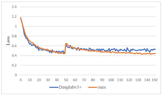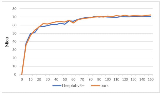 The traditional DeepLabV3+ algorithm is shown with blue lines, and the improved DeepLabV3+ algorithm is labeled with orange lines. The backbone networks used are both Mobilenetv2 networks. In general, both MIOU metrics increase with the number of training iterations, and the loss values both decrease with the number of training iterations, where epochs 0–50 are freeze training, and the backbone is unfrozen for unfreeze training after the freeze training is completed. Therefore, there is a jump in the loss values at the 50th unfreeze round. In this case, the loss value curve and the intersection, as well as concurrency ratio curve of the improved Deeplabv3+ algorithm, converge faster than those of the traditional Deeplabv3+ algorithm, and the loss value is lower and more accurate.