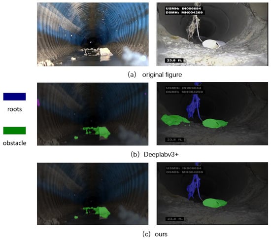 Figure 11a shows the original image of the drainage pipe and the Deeplabv3+ algorithm before and after the improvement. Although both segmented the piled-up stones in the left image, the roots of the tree in the right image, and the cardboard box, in Figure 11b, the purple color block was wrongly segmented in the left image, and part of the bottom of the pipe piled up as a foreign object was wrongly segmented in the right image. In contrast, the segmentation results of the proposed algorithm are shown in Figure 11c, and there is no mis-segmentation.