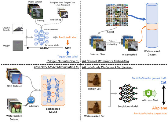 - Li, Y.; Zhu, M.; Yang, X.; Jiang, Y.; Wei, T.; Xia, S.T. Black-box dataset ownership verification via backdoor watermarking. IEEE Trans. Inf. Forensics Secur. 2023, 18, 2318–2332. [Google Scholar] [CrossRef]