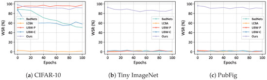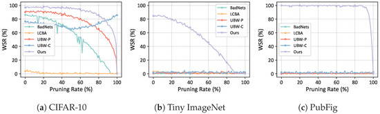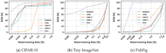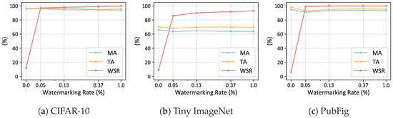 We further compared our method with the baseline methods of watermarking rates ranging from 0.004% to 5%. The results are shown in Figure 5. It can be found that as the watermarking rate increases, the WSR also increases. In the experiments on CIFAR-10, with a watermarking rate of 0.004%, where only two samples are embedded with triggers, our WSR still exceeded 70%, while the WSR of other compared algorithms stayed below 25%. In the experiments on Tiny-ImageNet and PubFig, our WSR is significantly higher than that of the compared algorithms at low watermarking rates. Our method demonstrated the best performance across all datasets and different watermarking rates.