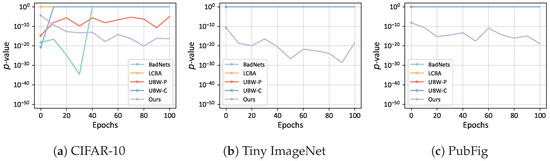 It is worth noting that our experimental setup uses a much lower watermark rate than what is commonly explored in the existing literature, where most studies employ watermark or poisoning rates between 5% and 20%. Because of this, neither the MA nor the TA of all methods showed a significant decline. Based on this result, our method is harmless to model performance. However, most of the comparison methods are ineffective at such a low watermark rate. Only BadNets, UBW-P, UBW-C, and our method remained effective on CIFAR-10, while on Tiny-ImageNet and PubFig, only our method maintained its effectiveness. In all experiments, the proposed method achieved the lowest p-value and the highest WSR. Our method achieved the best performance regarding effectiveness.