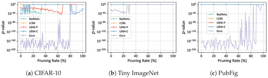 The comparison of robustness against pruning attacks is shown in Figure 8 and Figure 9. In the experiments on CIFAR-10, when the pruning rate is below 80%, our method has the lowest p-value and the highest WSR. The proposed watermarking process is effective until a pruning rate of 90%. In the experiments on Tiny-ImageNet, within a pruning rate of 28%, our p-value remains below and the WSR remains above 76%, where the watermark still can be verified. In the experiments on PubFig, our p-value remained below until pruning reached 84%, and the WSR stayed close to 100% until pruning reached 91%. Same as above, the comparison methods are ineffective on Tiny-ImageNet and PubFig. Therefore, the proposed method has better robustness against pruning attacks.