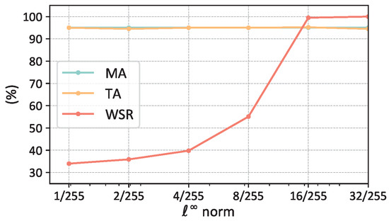 It indicates that the WSR increases as the trigger budget increases, while the MA and TA remain largely unchanged. When the -norm reached , the WSR reached 100%. As the -norm increased further, the WSR remained stable at 100%. Therefore, in our study, we set of -norm to .