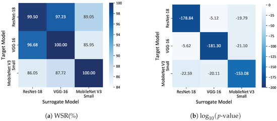 In this section, we analyze the performance of our method when the structure of the surrogate model differs from that of the target model. We do this to find out if the surrogate model using a different model structure compared to the target model would reduce the performance of the proposed dataset-watermarking method. We conducted experiments using commonly used classification models: ResNet-18 [31], VGG-16 [34], and MobileNet V3 Small [35]. We conducted experiments separately for each of the three models as either the surrogate model or the target model. A total of nine experiments were carried out using CIFAR-10. The results are shown in Figure 11.