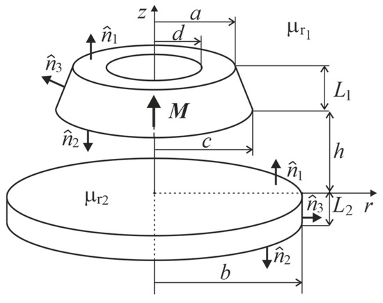 A ring permanent magnet (PM) of trapezoidal cross-section is homogeneously magnetized in the axial direction, where the magnetization vector is M. It is placed above the cylinder made of linear magnetic material with constant relative magnetic permeability (soft magnetic cylinder) (Figure 2).