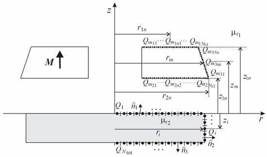 The magnetic sources positioned along the material boundaries can be linear [20,21], toroidal [22,23], or point-like [16], depending on the configuration of the problem being solved. Given that this study analyzes an axially symmetric structure, thin toroidal magnetic sources will be placed on the boundary surface between the magnetic material and air.
