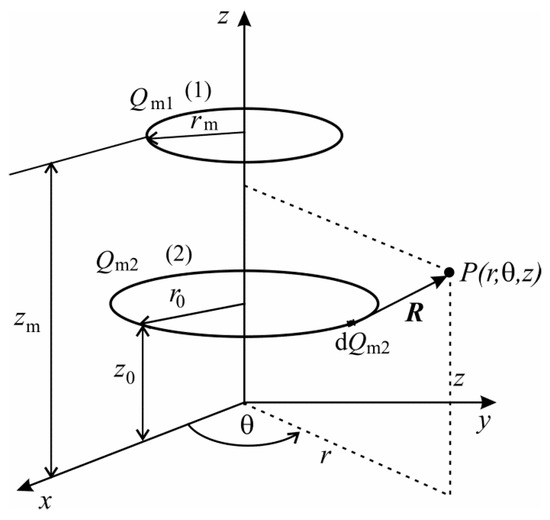 Once the values of the unknown magnetic sources have been determined, the magnetic force acting between the permanent magnet (PM) and the soft magnetic cylinder can be computed by combining the results obtained for the axial magnetic force between two circular loops. This method, as outlined in reference [8], involves calculating the magnetic force between two circular loops (Figure 4) with varying magnetization charges distributed uniformly.
