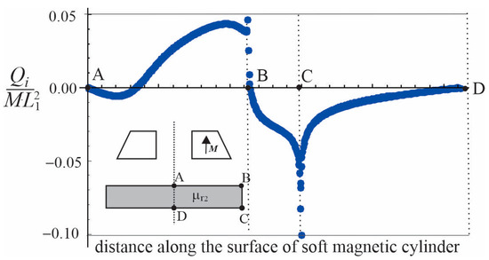 The distribution of calculated normalized magnetic charges, , along the boundary surface of the cylinder and the air is presented in Figure 6. From point A to B, the distribution of magnetic sources along the upper base of the cylinder is shown. From point B to C, the distribution is presented along the cylinder’s lateral surface, and from C to D, the distribution of magnetic charges is shown along the lower base. It is determined for the following configuration parameters: , , and . To confirm the accuracy of the applied approach once again, the force was calculated for these system parameters, yielding a value of . For the same parameters, using the FEMM software program, a value of was obtained, resulting in a relative error of 0.89%.