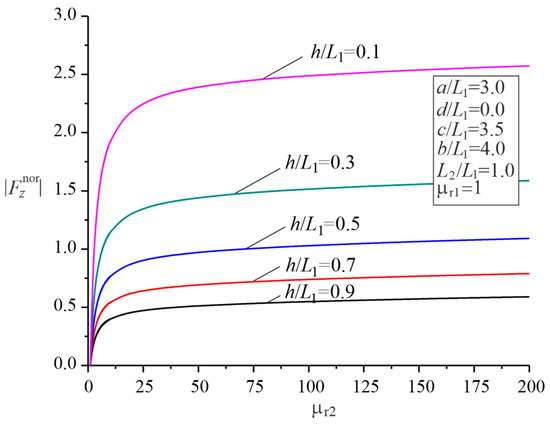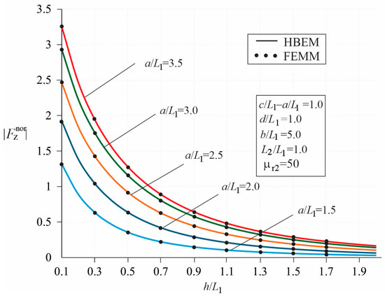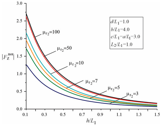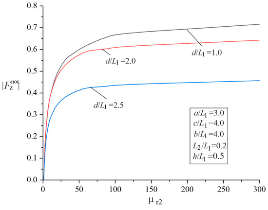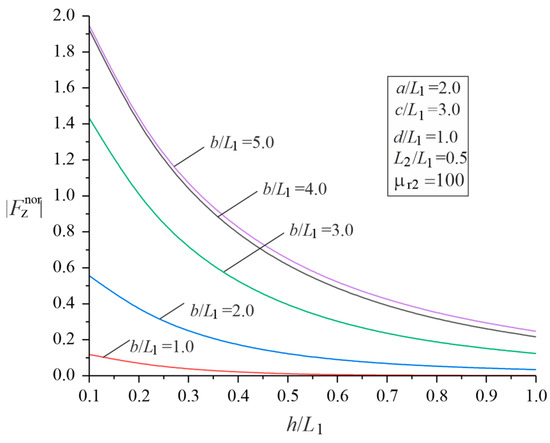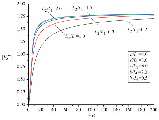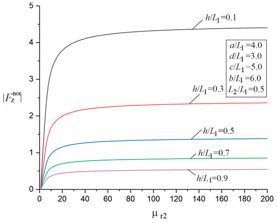 From Figure 9, it is evident that for smaller values of the magnet’s inner radius, the force intensity will also be greater since the magnet’s volume is larger in this case. Figure 11 shows that the height ratio of the magnet and the cylinder, , has a significant impact on the force intensity when this ratio is less than one. However, when the ratio is equal to or greater than one, the curves showing the dependence of force on magnetic permeability do not differ significantly.