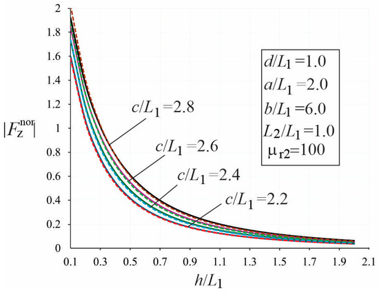 Figure 7, Figure 8, Figure 13 and Figure 14 show the dependence of the normalized magnetic force on the normalized distance between the magnet and the cylinder. In Figure 8, the dependence is shown for different values of the cylinder’s radius. As expected, the larger the cylinder’s radius, the greater the force, but after the value , the increase in force becomes negligible for further increases in the cylinder’s radius. Figure 9, Figure 10 and Figure 11 analyze the dependence of force on the relative magnetic permeability of the cylinder for different values of the magnet’s inner radius, (Figure 9), varying distances between the magnet and the cylinder, (Figure 10), and different height ratios of the cylinder and the magnet, (Figure 11). With an increase in the distance between the magnet and the cylinder, the force weakens. However, with an increase in relative magnetic permeability beyond 100, the force does not significantly change in intensity for certain dimensions of the magnet and the cylinder. This state is also demonstrated in Figure 13.