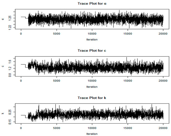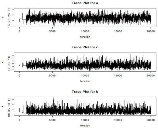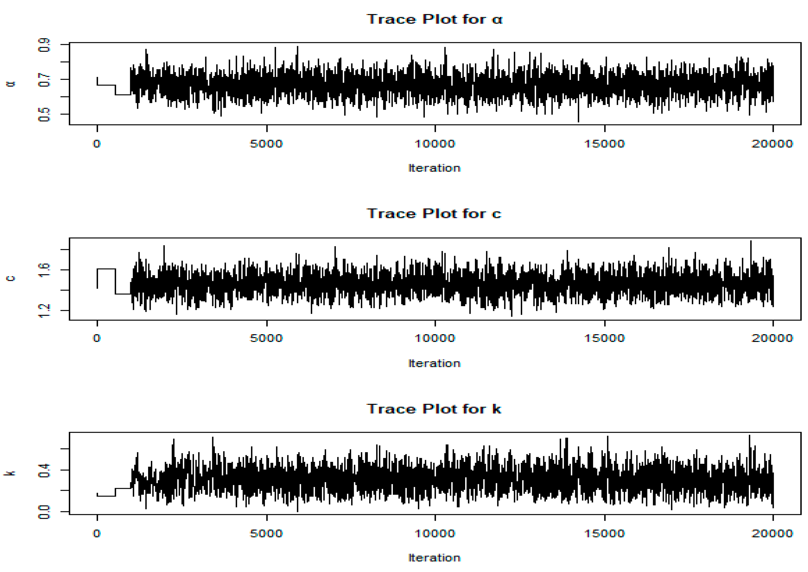 Trace plots of the parameters α, c and k for COVID-19 data from the United Kingdom.