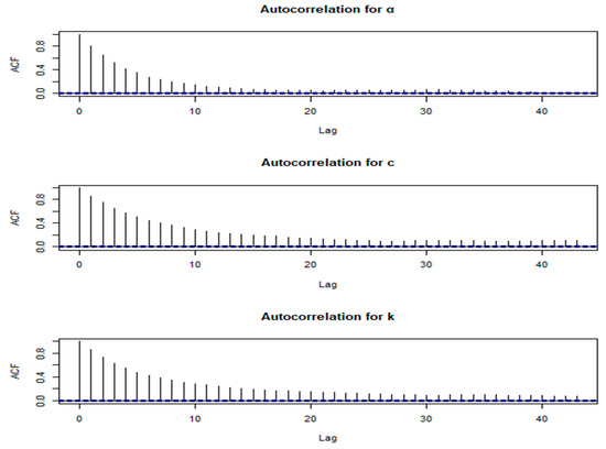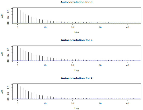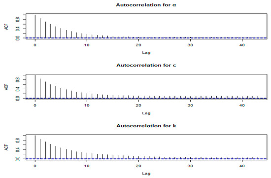 Autocorrelation plots of the parameters α, c and k for COVID-19 data from the United Kingdom.