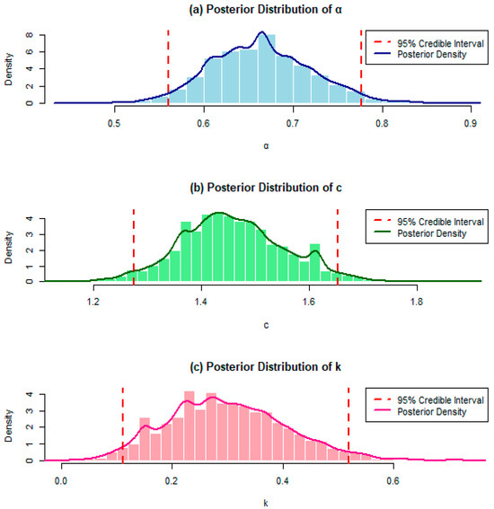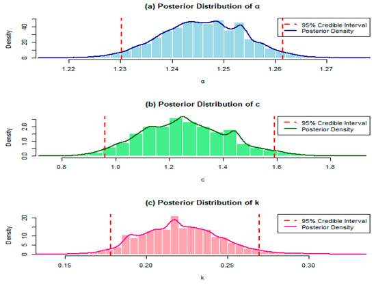 Histogram, posterior density and the lower and upper limits of the 95% credible intervals of the parameters of the Xg-BXII distribution for Wang’s data.