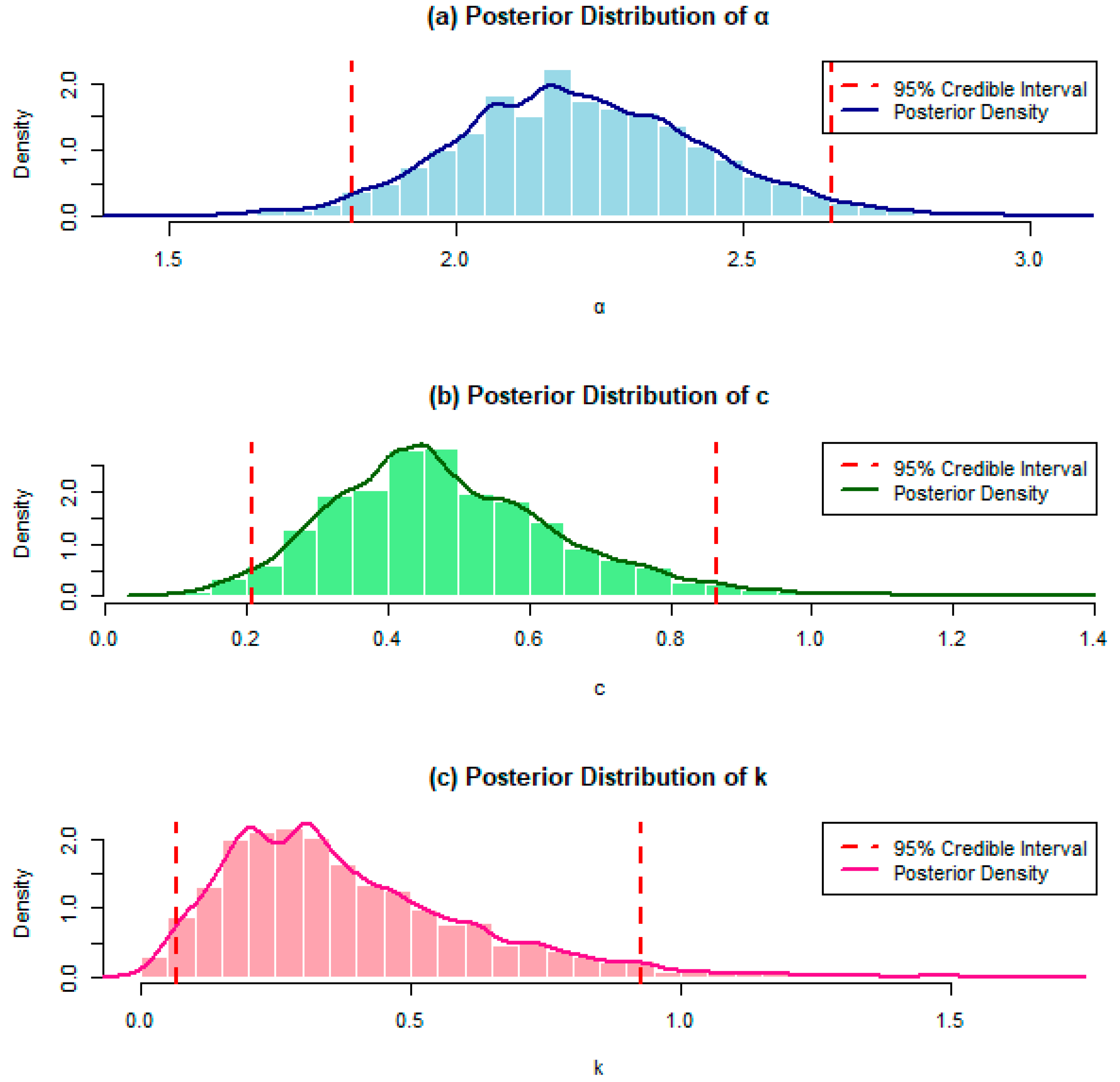 Histogram, posterior density and the lower and upper limits of the 95% credible intervals of the parameters of the Xg-BXII distribution for COVID-19 data from the United Kingdom.