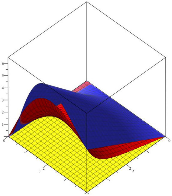 Below, we obtained three-dimensional graphs illustrating the convergence rates of operators to specific functions using the Maple [28] software.