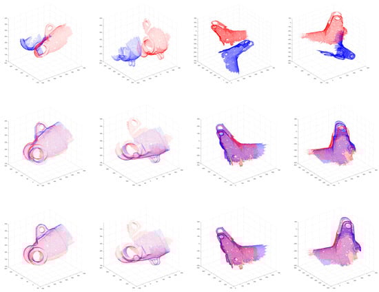 The point cloud registration results of the workpiece scanning model. Columns 1 to 4 are four different sets of point cloud data. Row 1 is the original point cloud pose, and rows 2 to 4 are registration results of TLBO-based, ATLBO-based, and PSO-based methods. The red image represents the target point cloud, and the blue image represents the source point cloud.