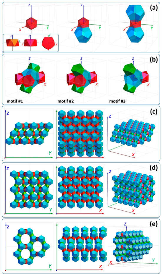 (a) Illustrates icosahedron employed as a binder of two adjacent dodecahedra (see Animation S1 in Supplementary Materials (SM)), (b) shows three different structural motifs (see Figure S3 in SM), (c) framework constructed by using motif 1, (d) framework constructed by using motif 2 (see Animation S2 in SM), (e) framework constructed using motif 3 (see Animation S3 in SM).