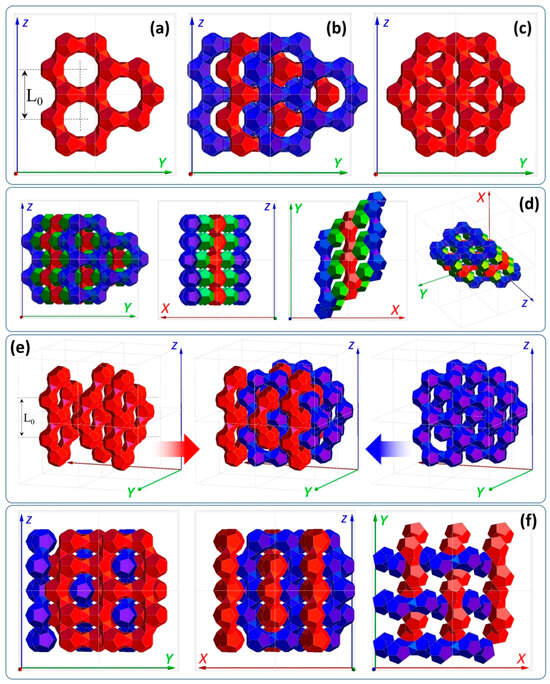 Figure 1a illustrates the strategy, which employs icosahedra as binders to connect adjacent dodecahedra. The inset figure highlights the geometry of the binder. It has the shape of a discus, bound by 10 equilateral triangular faces on the sides and 2 regular pentagonal faces on the top and bottom. As a result, it possesses a five-fold symmetry axis passing through the centers of the opposite pentagonal faces. These pentagonal faces will be shared with adjacent dodecahedra in the formed networks. In principle, each dodecahedron can be decorated with 12 identical binders of this kind (see Figure S2 in the Supplementary Materials). This simple protocol offers a multitude of possibilities for constructing interesting frameworks. As shown in Figure 1, the architecture of the final network depends significantly on the structural motif used. For instance, the structure presented in Figure 1c corresponds to motif 1 while Figure 1d to motif 2. Interestingly, the first structure possesses a three-fold symmetry axis (see Figure S5 in the Supplementary Materials). It appears that using a structural motif consisting of a single dodecahedron, decorated with six binders, leads to the formation of tightly packed networks. In contrast, motif 3, which has only four binders, can be assembled into the perforated networks shown in Figure 1e. This structure exhibits aligned, hexagonally organized elliptical hollow spaces, which could potentially be used as transport channels in membrane technologies. Obtained systems structurally resemble zeolitic molecular sieves [45]. It is worth emphasizing that it is possible to design frameworks in which all the above-mentioned motifs coexist, forming interconnected sub-frames, each potentially exhibiting different mechanical or transport properties (see Figure S6 in the Supplementary Materials). Similar to quasicrystals, they exhibit local order without translational symmetry and are constructed by combining only two polyhedra: a regular dodecahedron and an icosahedron-based binder. This allows for the arbitrary design of trusses with tailored properties, such as structures that are partially permeable yet mechanically stable. Figure 2 illustrates another family of frameworks, which relies on the 3-fold symmetry of the dodecahedron. These networks resemble structures observed in organic chemistry and can be arranged into two variants: (a) graphene-like connected dodecahedra (Figure 2a,b) and (b) a sheet of densely packed dodecahedra (Figure 2c). Two kinds of structural motifs can be distinguished here (see Figure S7 in the SM), both resembling the architecture of a flower with a central dodecahedron decorated with three or six petals. Moreover, these quasi-two-dimensional sheets of interconnected dodecahedra can be assembled into stacks resembling graphite-like forms (Figure 2d), with additional intercalated dodecahedra (shown in green) binding the layers together. Accordingly, this binding strategy leads to the formation of dodecahedral pillars, all aligned parallel, as clearly visible in the YX projection. However, this stacking protocol represents a very specific variant, because, in principle, each subsequent layer can be deposited in three different ways; that is, the outermost layer always offers three equivalent pentagonal faces for anchoring the binding dodecahedra. Therefore, it is also possible to design randomly bound stacks. Interestingly, the same sheets can also be assembled into the intertwined form illustrated in Figure 2f. As shown in Figure 2e, in order to design this architecture, two independent, perpendicular stacks (here colored in red and blue) have to be arranged first and subsequently merged together, leading to interlocking topology. It is worth mentioning that adjacent layers within the stacks are translated with respect to one another along the z-axis with the vector .