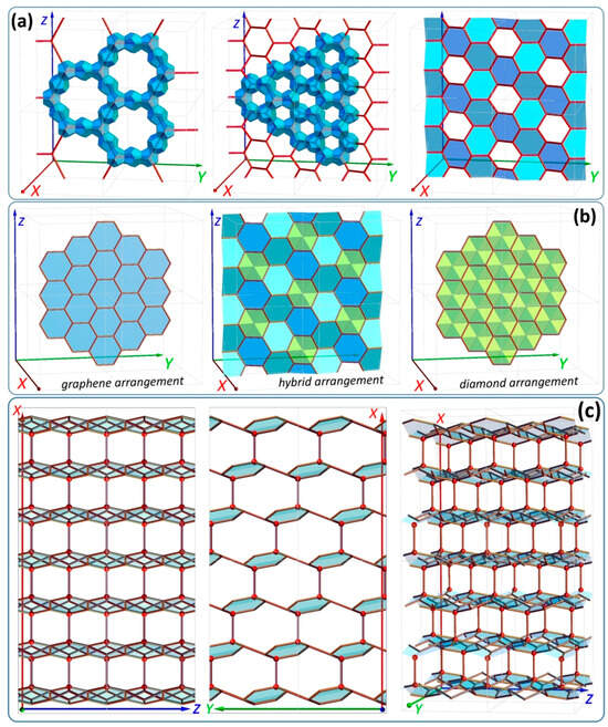 Figure 3a illustrates another type of framework, designed solely from regular dodecahedra. These dodecahedra are assembled into hexagonal rings, forming graphene-like sheets. The structure presented on the left-hand side consists of tightly bound dodecahedral pairs, where each pair shares one pentagonal face. In contrast, the structure depicted in the middle also involves pairs that are not fully bound together, meaning there is a small wedge-like gap between adjacent dodecahedra. This gap arises from the dihedral angle of the dodecahedron (φ ~ 116.565°). When three dodecahedra are clustered together, a small radial element is missing to form a closed structure: 2π − 3φ ≈ 10.3°. Figure S8 in the Supplementary Information shows how to construct an additional variant of densely arranged dodecahedra, as presented in the middle of Figure 3a. The mesh (colored in red) represents a network formed by connecting the central points of the dodecahedra. Interestingly, the resulting pattern resembles a distorted graphene sheet. Figure 3b compares two different carbon arrangements: the graphene arrangement (left-hand side), where all bond angles are 120°, and the diamond arrangement (right-hand side), where the bond angles equal the tetrahedral angle of approximately 109.47°. The pattern obtained here displays a hybrid arrangement, appearing as a transitional form between the two. By using this hybrid structure, it is possible to design a highly interesting scaffold that combines characteristics of both diamond and graphene. This structure is presented in Figure 3c and consists of mutually translated layers connected at sites marked by red dots. In the language of organic chemistry, each carbon atom occupying these specific sites would potentially be sp3 hybridized, forming bonds between adjacent sheets. The binder (connecting two dots) length, which determines the interlayer distance, has been adjusted to match the average distances between adjacent dodecahedra within the lattice shown in the middle of Figure 3a. This novel structure might be of interest in the context of phase transitions between carbon allotropes, specifically the graphite-to-diamond transition, which occurs under high-temperature and pressure conditions [46,47]. There has been a long-standing debate regarding the atomistic mechanism behind this structural transformation, which may result in two coexisting phases: cubic diamond (CD) and hexagonal diamond (HD, also known as lonsdaleite) [48]. It is tempting to investigate (for instance, using density functional theory) whether the model presented here could predict a phase transition, potentially leading to either CD or HD.