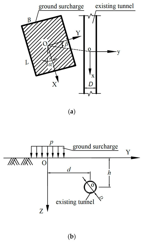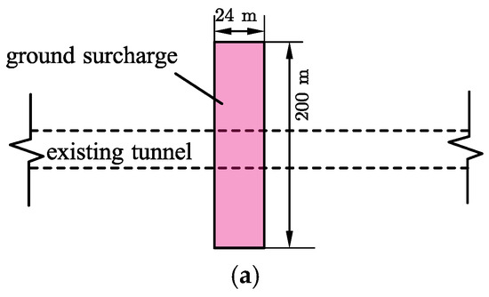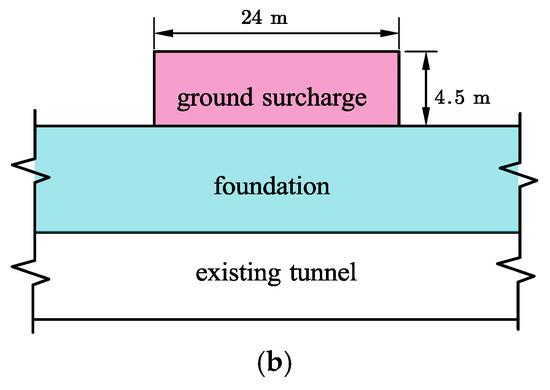A schematic of the position between the ground surcharge and existing tunnel. (a) The plan diagram; (b) the cross-section diagram.