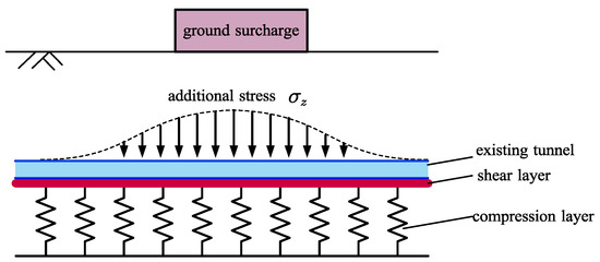 As illustrated in Figure 2, the schematic model used for calculating the settlement of the tunnel subjected to ground surcharge is based on several key assumptions: (1) The foundation is considered an isotropic, semi-infinite elastic body [11,21,23]. (2) The effects of the tunnel itself are neglected when calculating the additional forces on the tunnel subjected to the ground surcharge. (3) The Timoshenko model is employed to analyze the structural response of the existing tunnel, accounting for both bending and shear deformations. (4) The Pasternak model is adopted to describe the interaction between the tunnel and the surrounding soil, considering both the shear deformation and compression of the foundation.