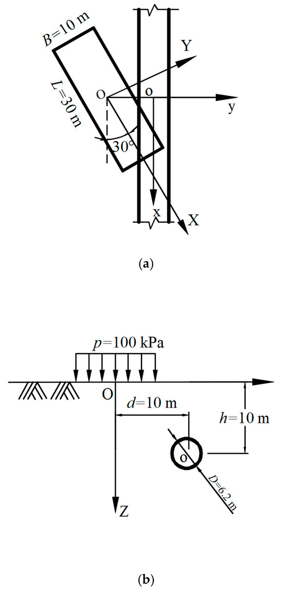The relationship between the settlement of the shield tunnel and several parameters was analyzed based on the method proposed in this paper. These parameters include the interaction angle α between the load center line and the tunnel axis, the distance d between the load center O and the tunnel center o, the tunnel burial depth h, and the load q. A schematic diagram of the engineering case used for the parameter analysis is presented in Figure 3. The tunnel and foundation parameters are consistent with those described in Section 3.4.
