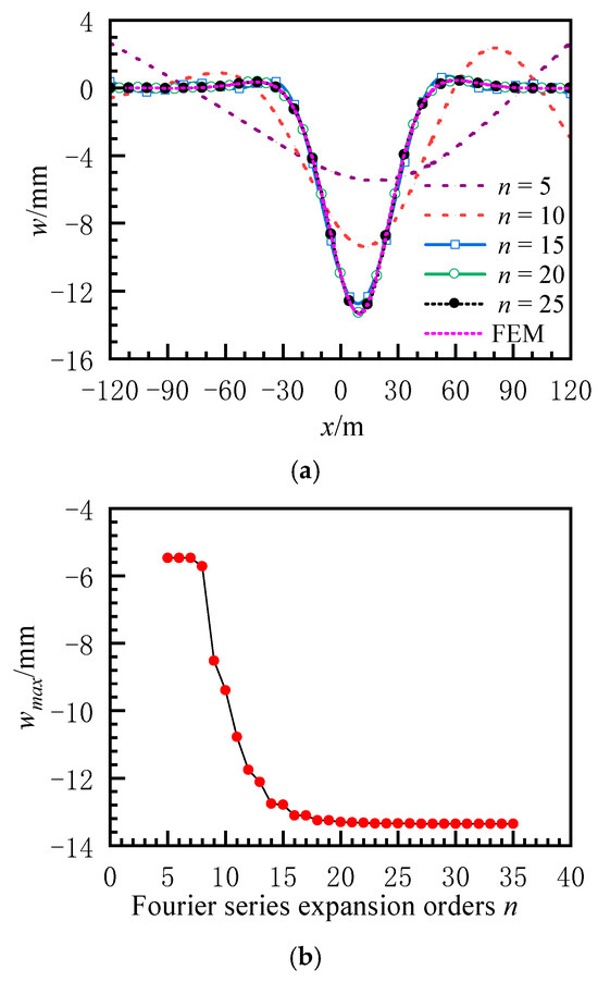 In this paper, the order of the Fourier series expansion is a crucial parameter that affects the accuracy of the results. Under the premise of meeting the accuracy requirements, a reasonable order should be determined to reduce the computational burden as much as possible. To illustrate this, assume an engineering case where the load position and related parameters are shown in Figure 3. The equivalent flexural rigidity (EI)eq is 7.8 × 107 kN·m2, the equivalent shear rigidity (GA)eq is 2.1 × 106 kN/m, the coefficient of subgrade reaction (kf) is 2000 kN/m3, and the shear modulus of foundation is 1200 kN/m.