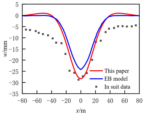 Figure 6 shows the correlation between the vertical displacement w at different locations along the tunnel and the distance x from the tunnel center. The red line represents the method proposed in this paper, where the tunnel is modeled using the Timoshenko beam model and the foundation is modeled using the Pasternak foundation model; the blue line represents Liang’s predicted results, where the tunnel is modeled using the Euler beam model and the foundation is also modeled using the Pasternak foundation; and the black scatter points represent in situ measurement data. A comparison reveals that the maximum settlement calculated using this paper’s method is 28 mm, which is closer to the measured data, while the maximum settlement predicted using the Euler beam model is 24 mm, showing a larger deviation. The Timoshenko beam model considers not only the bending stiffness but also the deformation caused by shear forces, and it can more accurately predict the settlement characteristics of the shield tunnel under complex loading scenarios. In contrast, the Euler beam model only considers bending deformation and neglects the effects of shear forces, leading to smaller predicted vertical displacements and an inability to accurately reflect the tunnel’s actual stress and deformation under real working conditions. Thus, the Timoshenko beam model demonstrates significant advantages in handling both shear and bending deformations, particularly in the case of shield tunnels, which are large structures subjected to significant surcharge loading. The impact of shear deformation is particularly critical in such engineering projects. By taking shear deformation into account, the approach presented herein more accurately represents the actual settlement behavior of the tunnel. Furthermore, the high agreement between the predicted results and the in situ measurement data validates the method’s reliability in practical engineering applications.