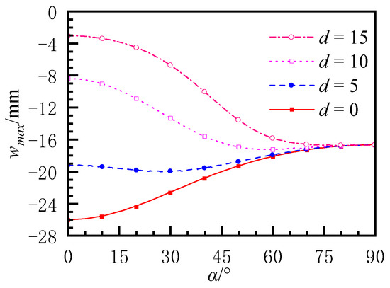 Assuming that other parameters remain unchanged, the interaction angle ranges from 0° to 90°, and the distances are d = 0 m, 5 m, 10 m, and 15 m. Figure 7 illustrates the connection between the maximum settlement of the tunnel and both the interaction angle and the distance.