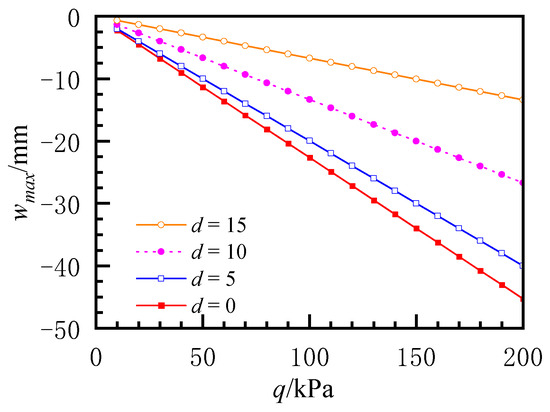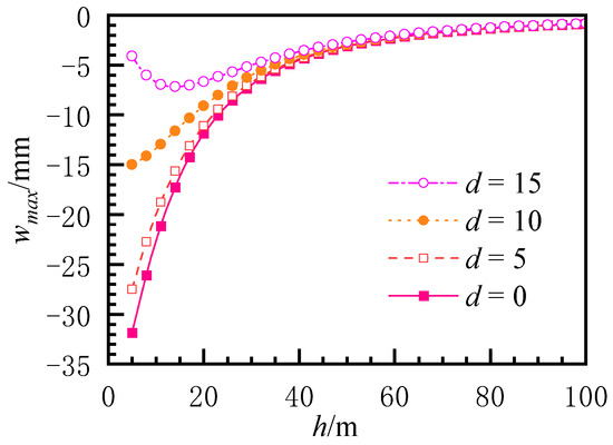 The burial depth varies from 5 m to 100 m, and the distances between the load center O and the tunnel center o are d = 0 m, 5 m, 10 m, 15 m, and 20 m. The relationship between the maximum settlement of the tunnel and burial depth and distance is shown in Figure 8. The maximum settlement gradually decreases as the burial depth increases for depths of 0 m, 5 m, and 10 m. A smaller burial depth results in a quicker reduction in the maximum settlement. This phenomenon occurs because as the tunnel approaches the load center, the additional force exerted by the load on the tunnel diminishes with the increased depth at which the tunnel is buried, leading to a decrease in the maximum settlement.