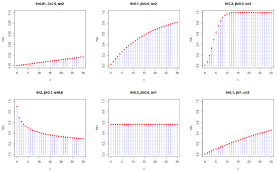 Some PMF and HRF plots for the DWE model generated under selected parameter values are shown in Figure 1 and Figure 2. From Figure 1, it can be seen that the PMF plots of the DWE distribution exhibit various shapes, which include symmetric, right skewed, increasing, decreasing, J-shaped, and reversed J-shaped curves. Additionally, Figure 2 reveals that the HRF of the DWE distribution presents a variety of shapes. In particular, it can be increasing, increasing–constant, decreasing, uniform, or monotonically increasing. These observations strongly suggest the great flexibility of the DWE distribution in fitting data.