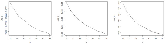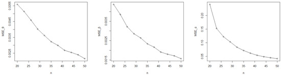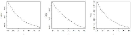 The mean square error (MSE) was applied to evaluate the MLE, for every parameter. The number of iterations for each case in the simulation was nsim = 10,000. The mean square error (MSE) can be calculated as