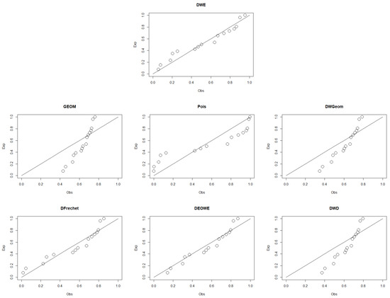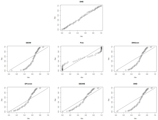 p-p plots for the DWE and other considered distributions for the first data set.