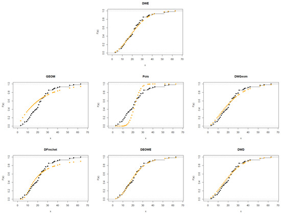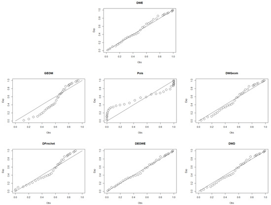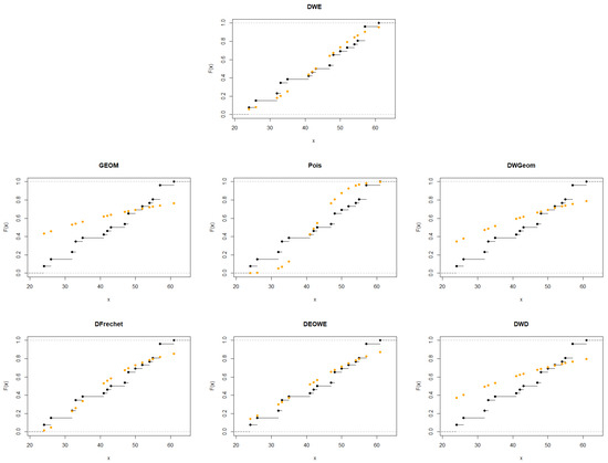 The first data set is presented in [24]. It contains 26 observations that indicate the failure times for a specific product. This information has also been used in [11,25]. Figure 6 and Figure 7 show the p-p plot of the fitted distributions and the empirical CDFs for this data set. A summary of the MLE results for the parameters, along with the SEs, log-likelihood, AICc, AIC, BIC, and HQIC for each distribution is provided in Table 3.