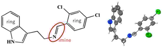Murugan (2023) [] reported a Schiff base compound (2,4-dichlorobenzylidene)[2-(1H-indol-3-yl)ethyl] amine (C17H14Cl2N2), aiming at the pharmaceutical and biological functions of indole. According to the journal’s rule (IUCr Data), which is highly systematic, numerical data are reported in tables and the essential structural description in the text. As regards the molecule, the imine C=N bond length (1.256(3) Å) and dihedral angles between planar moieties (phenyl group) were reported, and the E-configuration around the double bond was highlighted, as shown in Figure 2. Intermolecular hydrogen and π-π interactions were also mentioned in the text.