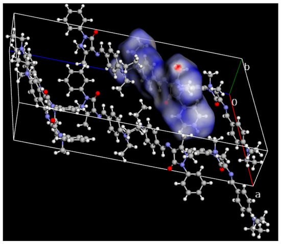 Shankar et al. (2023) [] reported two 4-amino antipyrine Schiff base compounds in the systematic format of Acta Cryst. E, aiming at the antioxidant, anti-putrefactive, and optical functions of antipyrine. Important covalent bond lengths (1.291(2) Å, mainly the imine C=N double bond of E-configuration) and bond angles (sum of three = 350.47(9)° < 360°) or dihedral (–177.11(11)°) angles were mentioned and listed. There are three (five- and six-membered) planar ring moieties in the molecules, and the dihedral angles between planes (e.g., 54.87(7)°) were mentioned in the text. Intermolecular hydrogen bonds, including halogen atoms, were also mentioned in the text. As shown in Figure 4 (C22H26N4O), Hirshfeld surface analysis was also employed to discuss the intermolecular interactions (see later section on intermolecular interactions).