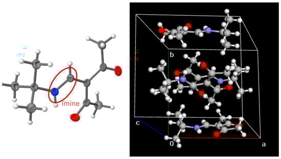 Halz et al. (2003) [] reported three Schiff bases derived from 3-formylacetylacetone and three amines in Acta Cryst E from the interest of organic synthesis. Only one (C14H17NO2) of the three formed chiral amines (due to asymmetric carbon) crystallized in the space group P21, as depicted in Figure 5. Double bond (enamine C=C and C=N) distances and torsion angles of C-C-N-C bonds (e.g., −134.31 (11)° for achiral bonds) were reported in detail for three compounds. Intramolecular and intermolecular hydrogen bonds were described and analyzed using Hirshfeld surface analysis.