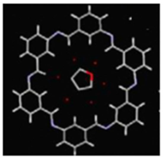 Matsumoto (2023) [] reported a macrocycle Schiff base compound (C42H30N6·0.5THF(C4H8O)·3H2O) derived from hexakis(μ-phenyleneimine) as a functional material. The figures depict both the molecular structures and crystal-packing structures. However, it should be noted that detailed numerical data were only reported in the supplementary data of geometry. The important fact (overall molecular shape and size) is that it adopts an outer-rim configuration with respect to its six N atoms and has a chair conformation. According to the top view, the THF molecules were located at the center of the pore over the ring. According to the side view, the ring molecule slightly deviates from a genuine planar shape, forming stacked columns in the crystal (Figure 7).