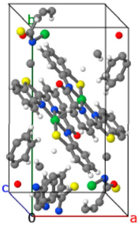 Crystal packing of the Ni(II) complex with an unsymmetrical ligand (Ni···Ni = 3.3305(9) Å). White—H; black—C; green—Ni; red—O; blue—O; yellow—S [].