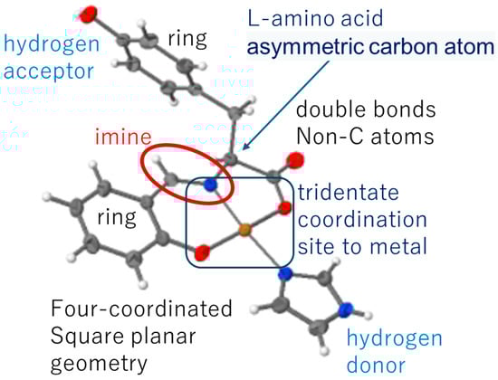 Cu(II) complex with a tridentate amino acid Schiff base ligand [] with various structural aspects mentioned in Figure 1 marked.