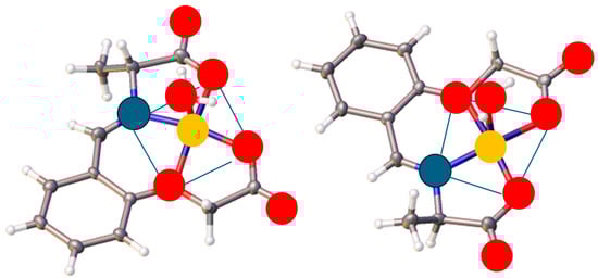Valentova et al. (2023) [] reported chiral Schiff base ligand (from DL-α-alanine, β-alanine, taurine, and γ-aminobutanoic acid)-induced E/Z-isomerism in Cu(II) complexes (C12H13CuNO6) aiming at urease inhibitory activities. The coordination features of the tetradentate chelate ligands and the resulting distorted square-based pyramidal coordination geometry around the central Cu atom (containing the apical water ligands) were confirmed. Moreover, stereochemistry involving optical isomerism (chirality; R/S) and E/Z-isomerism was investigated based on the crystal structures (Figure 10). However, the Flack parameters were reported only in the supplementary information (not in the table of crystallographic data in the main body).