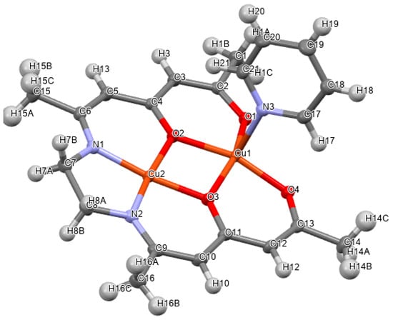 Ranaweera et al. (2023) [] reported a dinuclear metal complex with a cyclic Schiff base ligand, including six sites (atoms) ready for the coordination of two metal ions ([Cu2(C16H20N2O4)(C5H5N)]) (Figure 11). The coordination geometries (bond distances and angles) around the two metal centers, including the displacement of the apical ligand from the mean basal plane, crystal packing, and intermolecular hydrogen bond interactions, were mentioned. It should be noted that Bond Valance Sum (BVS) calculations were used to investigate the oxidation states of the metal ions based on their bond distances. The BVS calculation was performed to investigate the oxidation states of the two copper ions separately based on the Cu-L lengths, which may be the basis for the preparation of catalytic precursors.