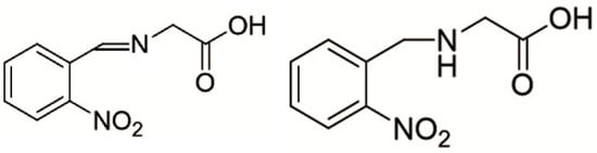 Jiang et al. (2023) [] reported 2-nitrobenzaldehyde amino acid Schiff base reductive amination compounds (Figure 14) with characteristic nitro-groups (C9H10N2O4). Note that there are several typical sites where hydrogen bonds can occur. The space group and molecular structure (mainly the geometries of the hetero atoms, including nitro-groups) were mentioned in the text and a table. In particular, the dihedral angles of the planar moieties, sp2 and sp3 hybrid orbitals of the C and N atoms, and π-electron delocalized systems involving ring or double bonds were observed based on the crystallographic results. In addition, intermolecular hydrogen bonds and crystal-packing figures were highlighted in the text.
